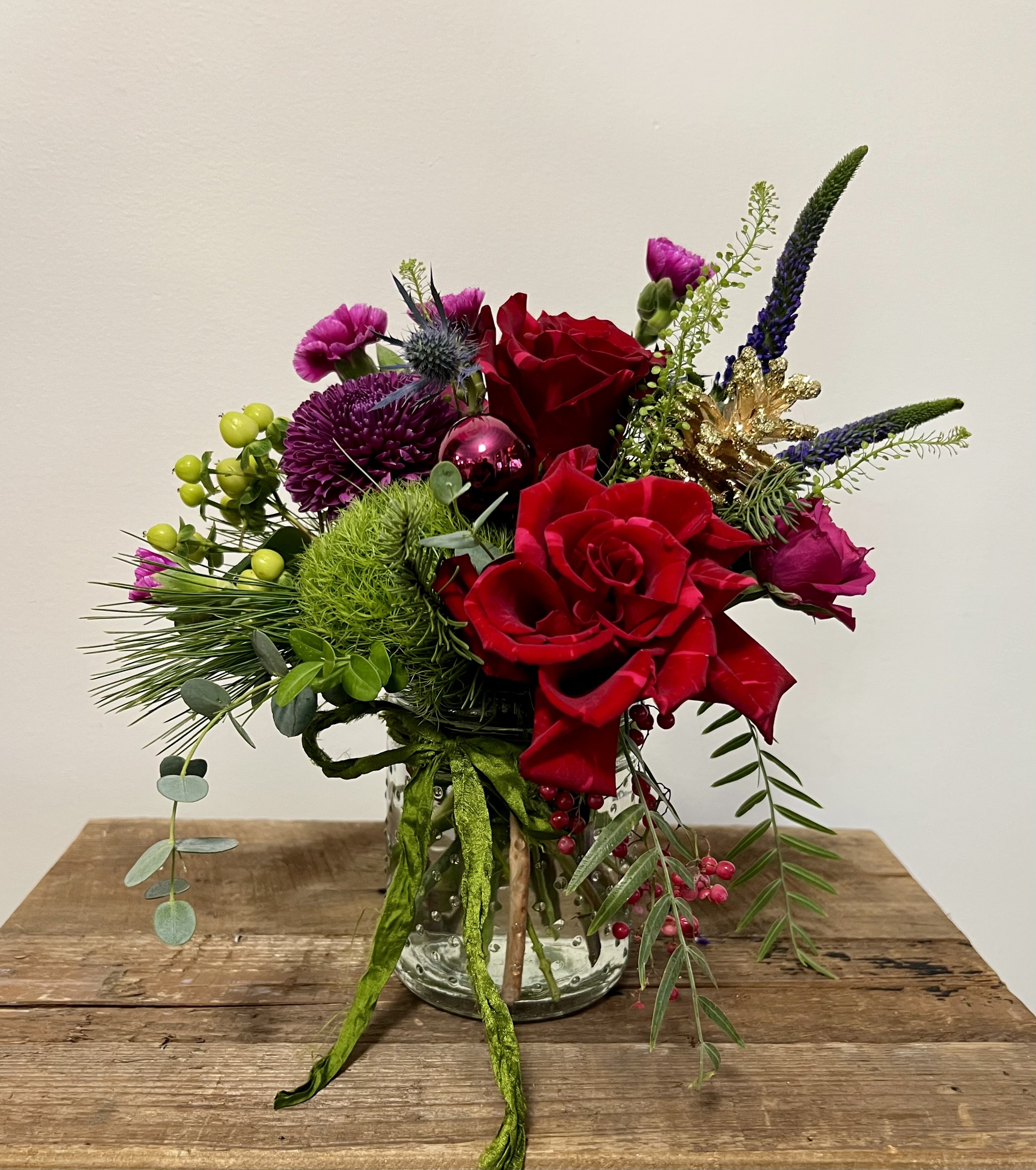 Bring the beauty of the season into your home with this exquisite holiday floral arrangement. Designed in a sophisticated ceramic vessel and adorned with a festive ribbon, this centerpiece exudes timeless elegance. It features a rich variety of holiday greenery and eucalyptus, complemented by dried citrus slices, cinnamon sticks, natural pinecones, birch branches, and vibrant ilex berry. Accented with other long-lasting florals, this arrangement is perfect for enhancing your holiday table or gifting to someone special. A true celebration of nature's winter bounty, it’s a delightful addition to your seasonal decor.